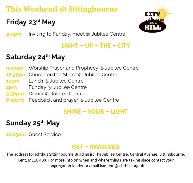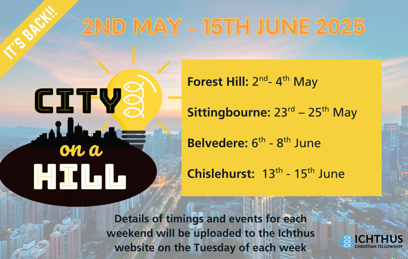 City on a Hill 2025 is here! For four weekends, we as the Ichthus movement will be on mission at four of our congregations, shining our lights for the sake of our King, Jesus. These weekends will be packed with all kinds of evangelism, from church on the streets to evangelistic quiz nights! Watch this space for more details of the events and timings of each weekend.