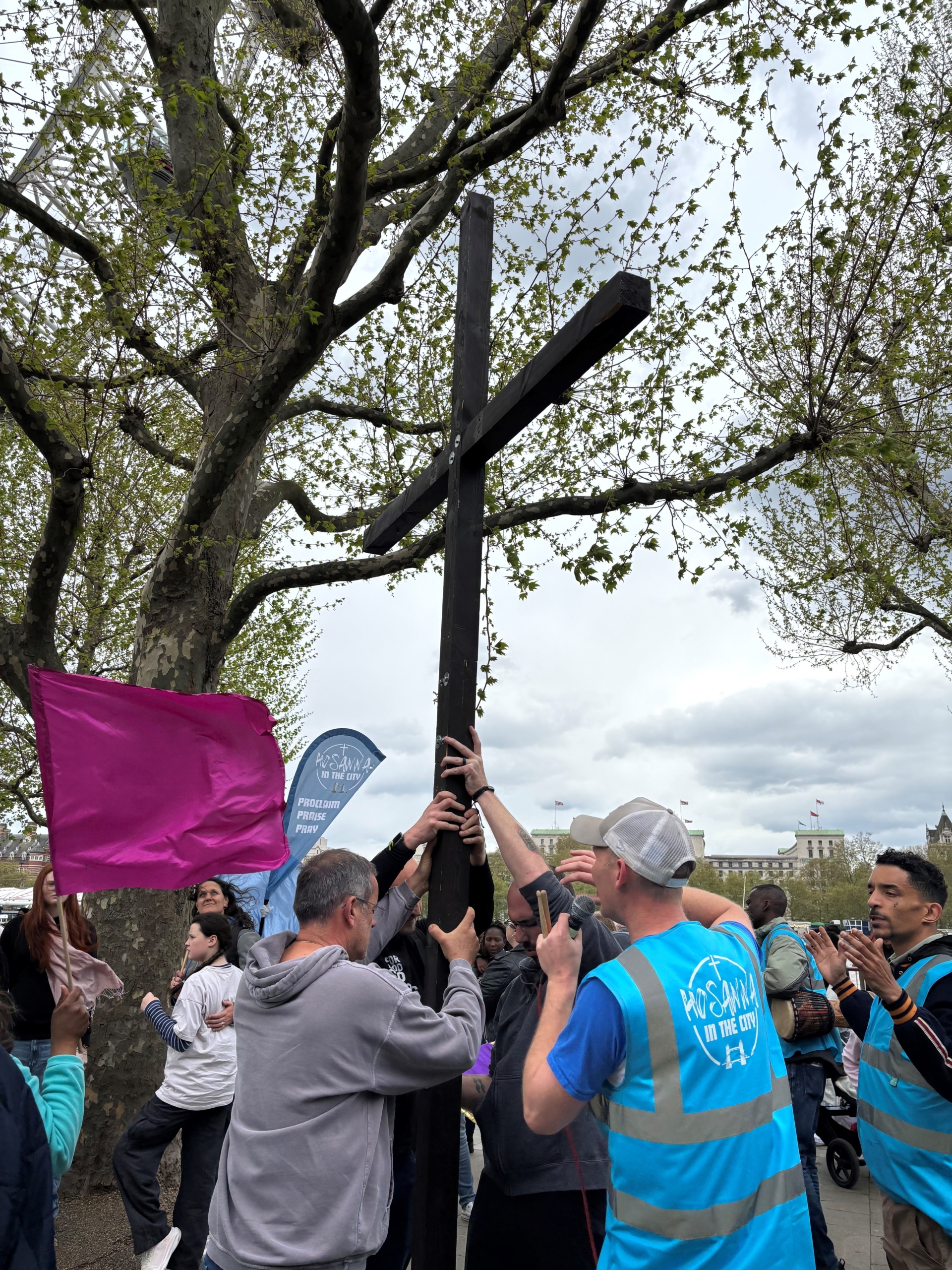 Finally, we arrived at our last meeting point: the London Eye, opposite Parliament. There we stopped to pray over London, over all the seeds that had been sown, with the cross lifted high against the skyline. It was a momentous moment. The presence of the Holy Spirit was tangible. It’s as if all the surrounding area became still. People felt drawn to the cross and compelled to stay close to it, eyes closed, just waiting, listening, hoping for something. It was an amazing opportunity to share the Gospel and pray for those individuals and allow them to respond to the message of Jesus—that He saves and redeems.
