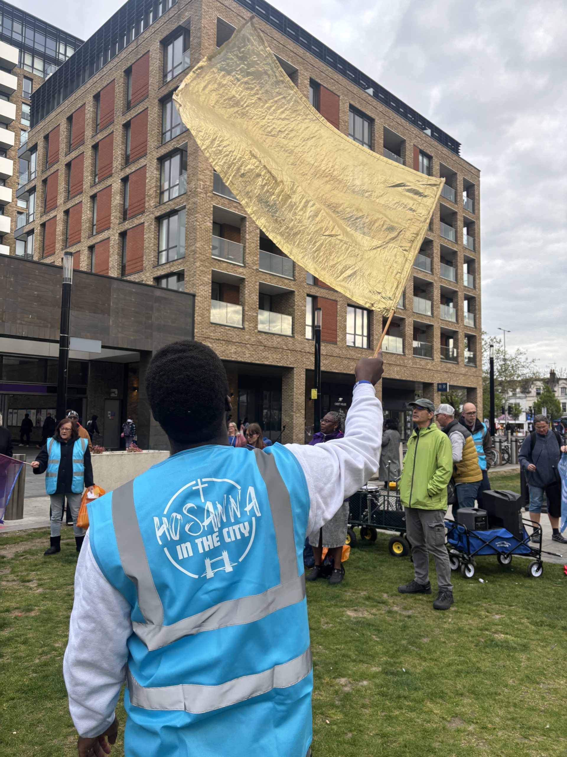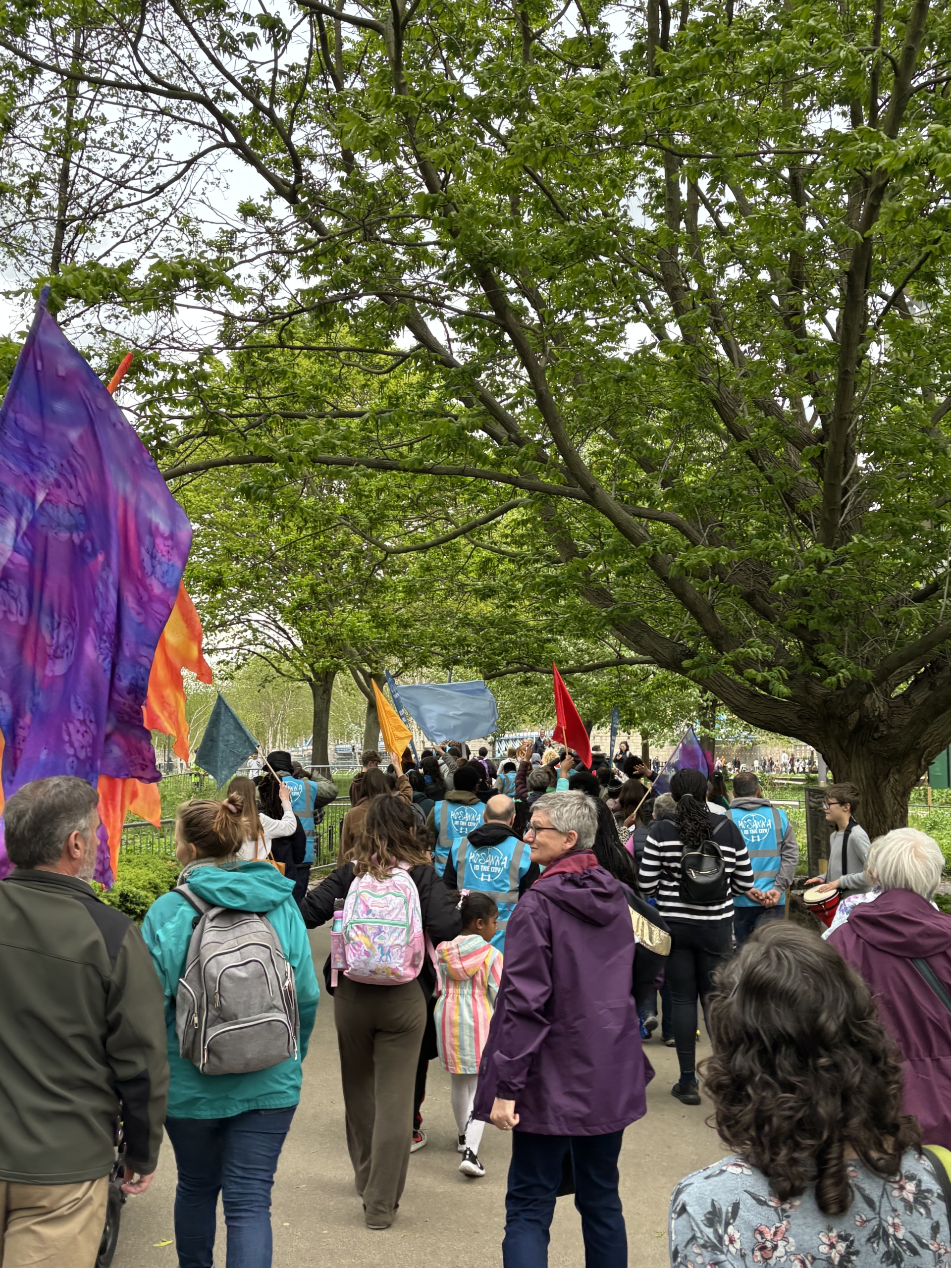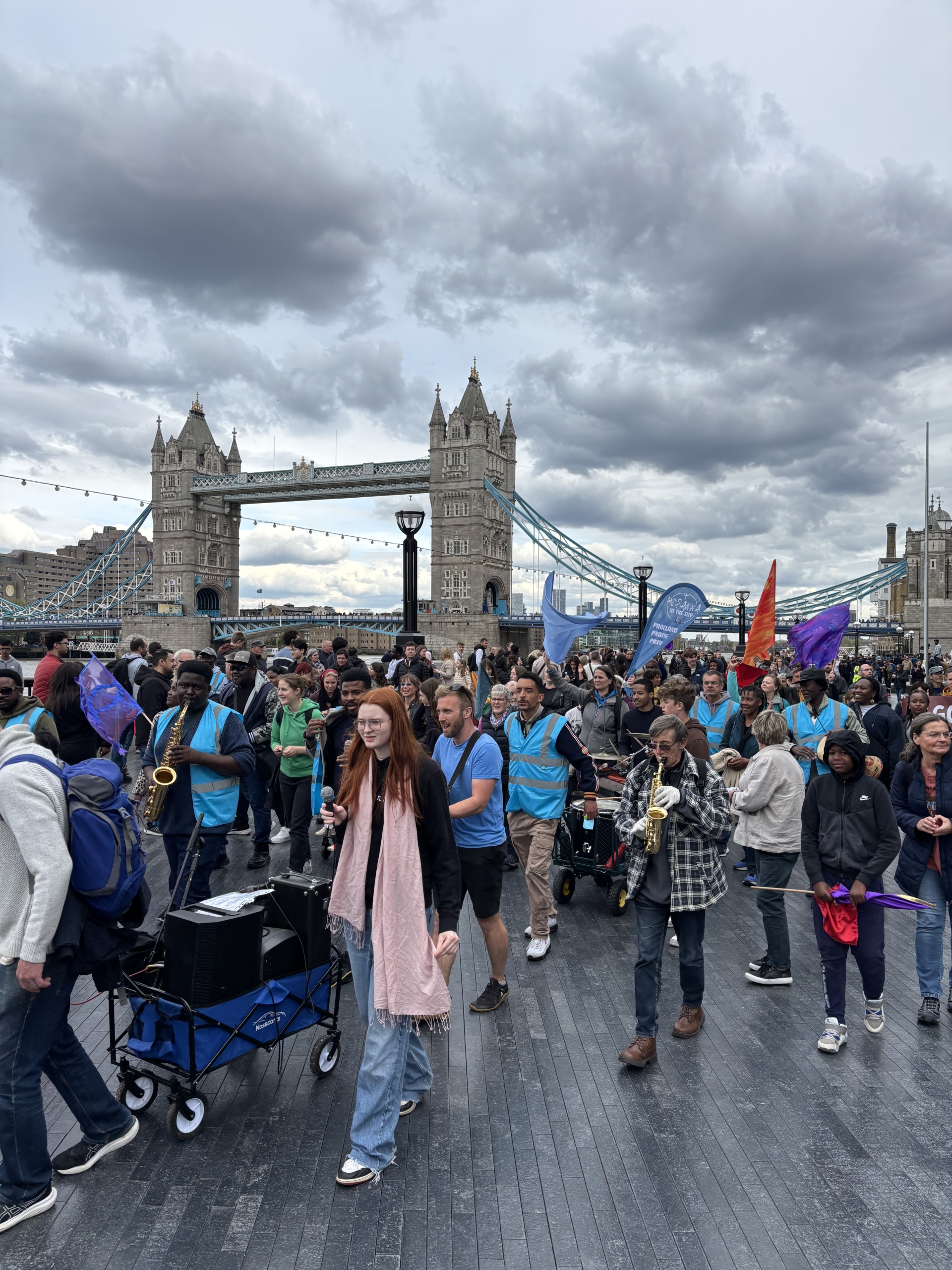 We proclaimed along the South Bank of the River Thames, quite literally making a loud, joyful noise with guitars, drums, bongos, tambourines, trumpets, violins, flutes, flags, banners—voices joined together in unity and the cross carried at the front, leading our procession. This was one of those experiences where “you just had to be there”.